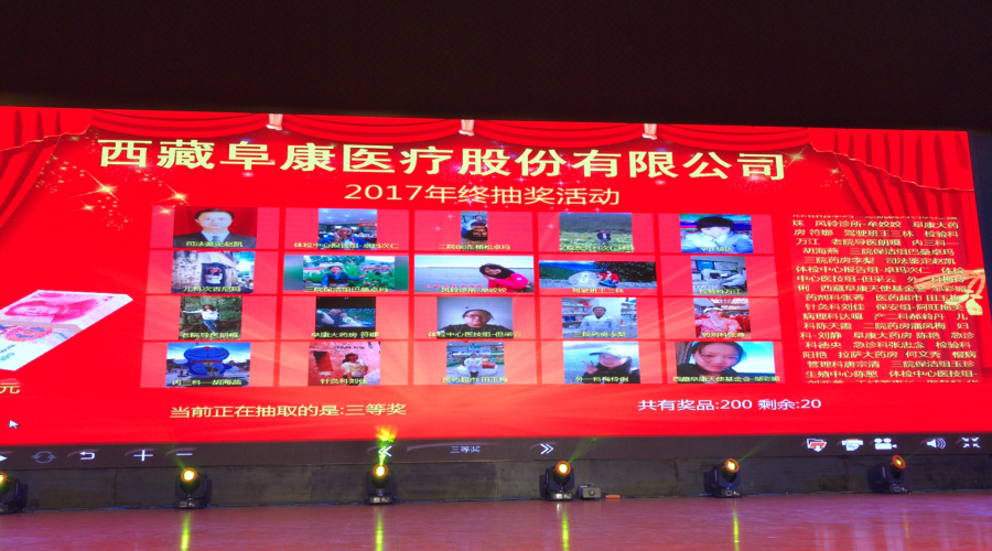 2018年1月10日,西藏阜康醫(yī)療股份有限公司新年團(tuán)拜會(huì)在拉薩洲際酒店舉行,下午四點(diǎn)來自西藏阜康醫(yī)院、婦產(chǎn)兒童分院、心腦血管分院、健康體檢中心、阜康大藥房、超市的員工陸續(xù)來到會(huì)場(chǎng)。下午五點(diǎn),主持人劉連福院長(zhǎng)宣布會(huì)議正式開始,場(chǎng)內(nèi)音樂響起,董事長(zhǎng)王斌帶領(lǐng)醫(yī)院領(lǐng)導(dǎo)和特邀嘉賓入場(chǎng),會(huì)場(chǎng)立刻響起雷鳴般的掌聲和歡呼聲。