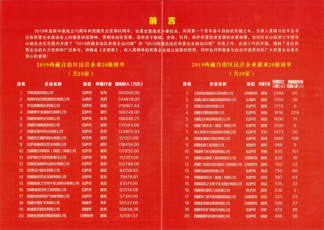 為表彰先進(jìn),樹(shù)立典型,西藏自治區(qū)工商聯(lián)(總商會(huì))決定授予20家民營(yíng)企業(yè)"2019西藏自治區(qū)民營(yíng)企業(yè)20強(qiáng)”稱(chēng)號(hào),授予20家民營(yíng)企業(yè)"2019西藏自治區(qū)民營(yíng)企業(yè)就業(yè)20強(qiáng)”稱(chēng)號(hào)。