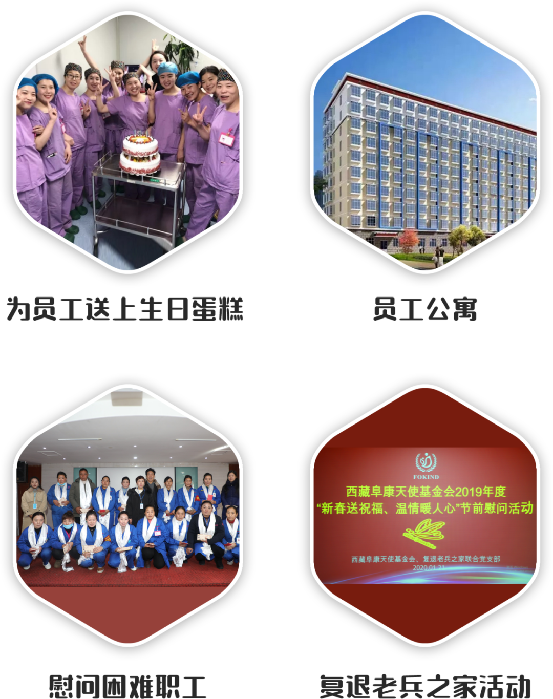 阜康醫(yī)療始終堅(jiān)持"以人為本”,高度關(guān)注員工工作生活,采取有效措施為員工排憂解難。公司積極協(xié)調(diào)員工的住宿問(wèn)題,解決了大部分員工的住宿問(wèn)題;公司職工"五險(xiǎn)一金”參保率100%;為困難員工及家屬減免醫(yī)療費(fèi)用;為員工免費(fèi)提供一日三餐;接送城關(guān)區(qū)員工子女上下學(xué);建立了"退伍老兵之家”、"黨員活動(dòng)室”;每年三大節(jié)日期間,公司黨委深入困難職工家庭慰問(wèn);建立為員工送上生日蛋糕并為其父母寄300元慰問(wèn)金的制度。廣大員工切身感受到了公司的關(guān)懷和溫暖。