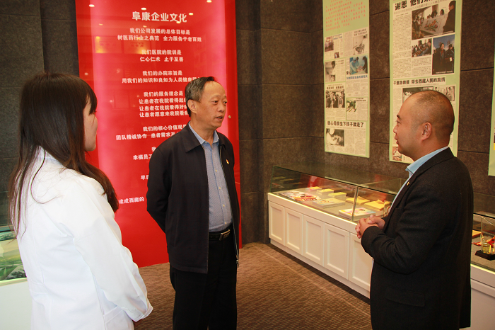 在阜康醫(yī)院五樓院史館,劉連福向劉家杰一行介紹了阜康醫(yī)療不平凡的發(fā)展歷程以及阜康人在黨的建設(shè)、抗震救災(zāi)、公益事業(yè)、企業(yè)文化等方面的成就,劉家杰一行對(duì)阜康醫(yī)療各方面的工作表示充分認(rèn)可并對(duì)"阜康”中所含的物阜民康——"物產(chǎn)豐富,民族安康”之意表現(xiàn)出極大的興趣,希望通過(guò)阜康人在醫(yī)藥領(lǐng)域的不懈努力,勇于攀登醫(yī)學(xué)高峰,為西藏的醫(yī)療發(fā)展貢獻(xiàn)力量。