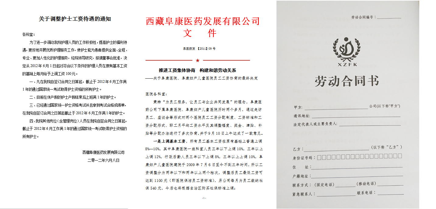 近年來,西藏阜康醫(yī)療股份有限公司高度重視工資集體協(xié)商工作,始終堅(jiān)持以人為本,維護(hù)職工合法權(quán)益,認(rèn)真貫徹《集體合同規(guī)定》。實(shí)行院務(wù)公開,發(fā)揮職代會作用,認(rèn)真聽取員工在工資集體協(xié)商方面的意見和建議,根據(jù)需要召開職代會聯(lián)席會議,建立穩(wěn)定的分配機(jī)制和增資機(jī)制,保障了員工對公司工資分配的知情權(quán)、協(xié)商權(quán)和監(jiān)督權(quán)。認(rèn)真履行《勞動合同》,設(shè)立了員工養(yǎng)老、醫(yī)療、工傷、生育、失業(yè)等保險(xiǎn),并足額上繳到位。